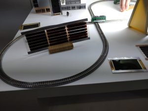 <ペロブスカイト有機太陽電池(中心の黒いパネル)の発電で、おもちゃの電車がレール上を走る。室内の暗い照明でも発電>
